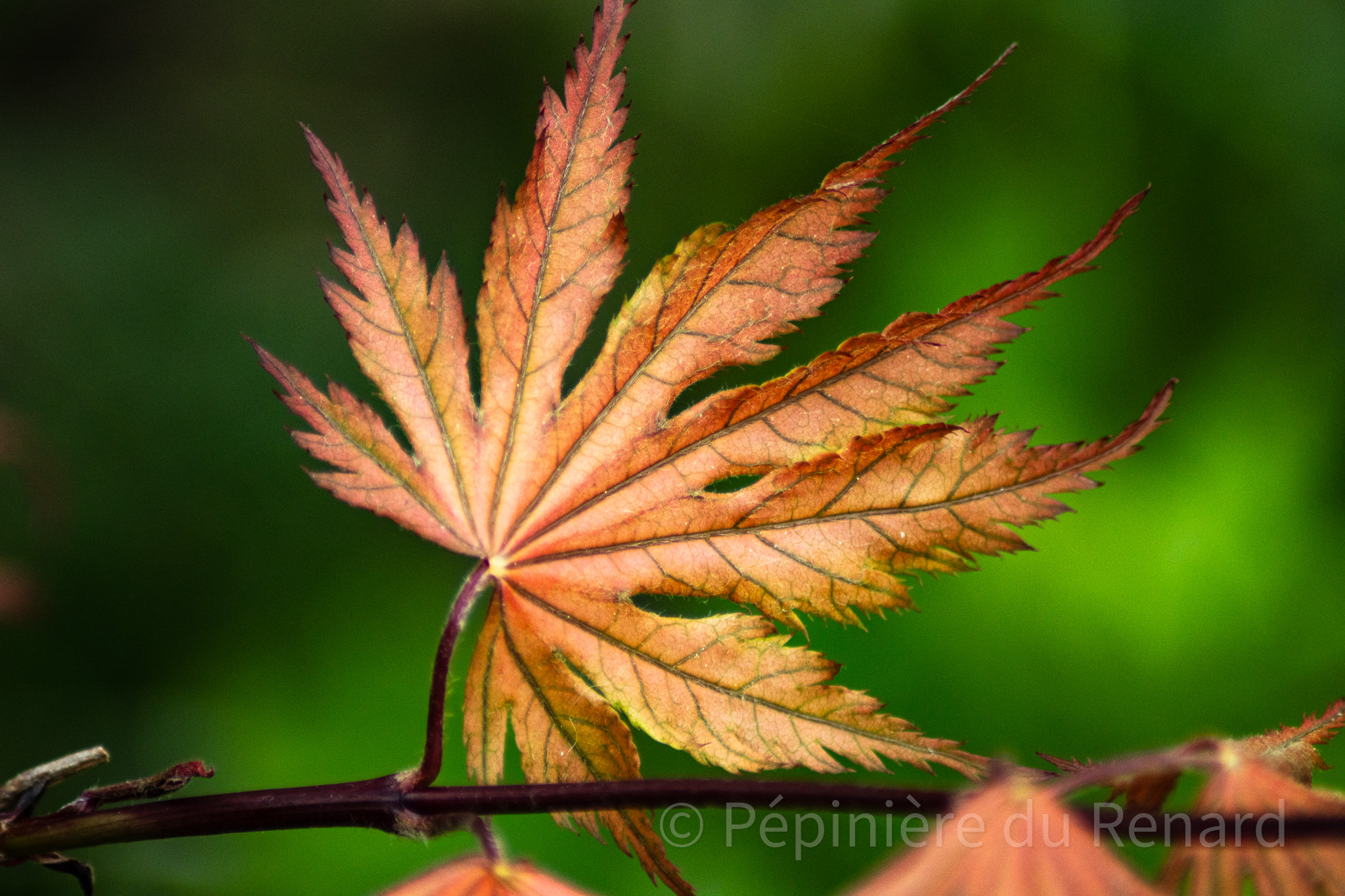 ‘Kasagi Yama’ is a Japanese maple with veined / marbled foliage that changes markedly through the seasons. In spring, new leaves often show a brick-pink / rosy red tone with green veins (sometimes a green–cream–pink marbled effect). Summer turns more bronze or brown-green, then autumn returns to raspberry red to red shades, often still visibly veined. Upright habit, gradually opening out with age.