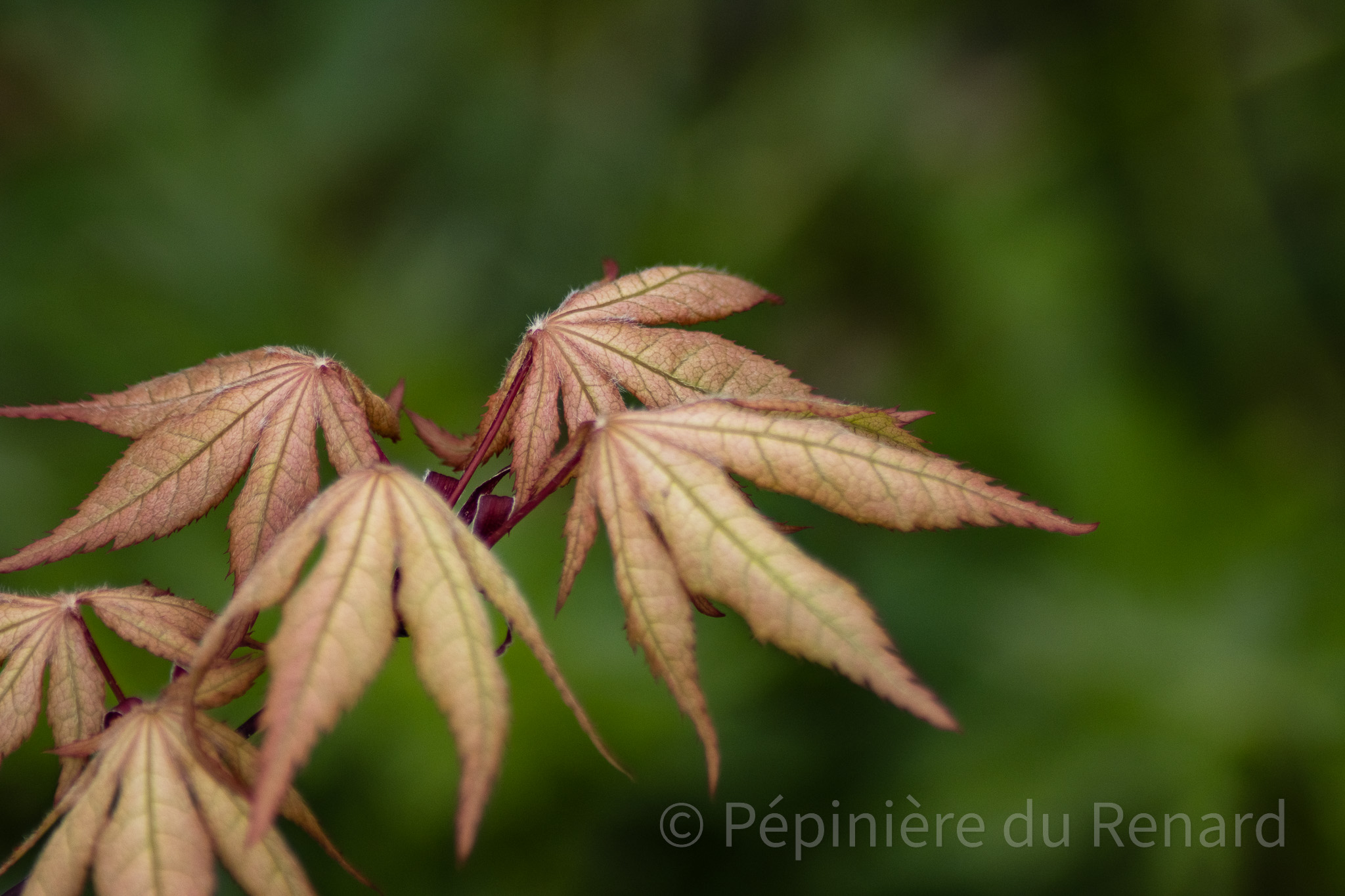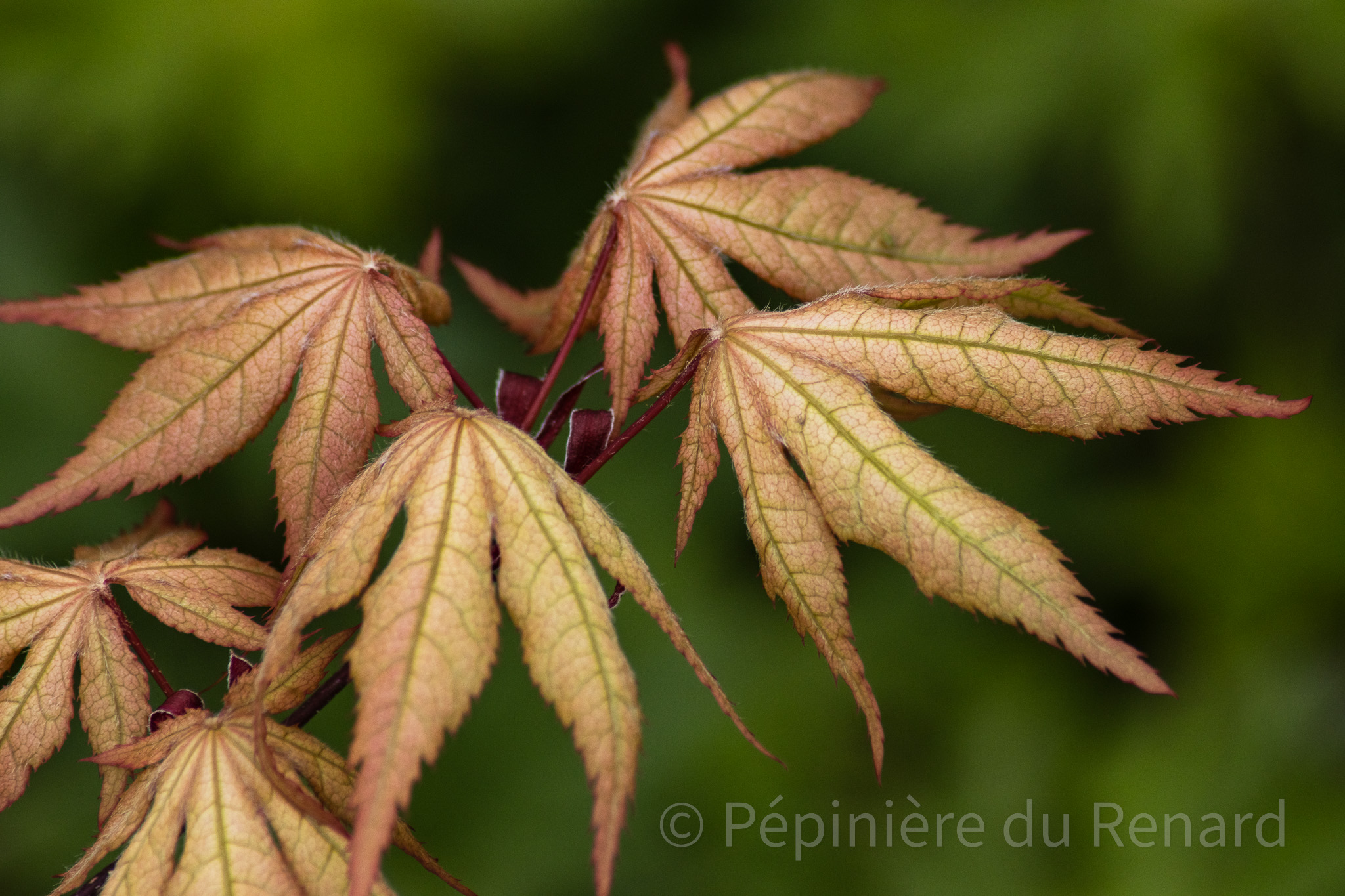 Érable du Japon réticulé : feuilles claires traversées de nervures vert foncé très marquées. Le printemps démarre souvent sur un rose corail veiné de vert, puis la saison bascule vers une teinte ambre caractéristique en été. À l’automne, la palette devient orange