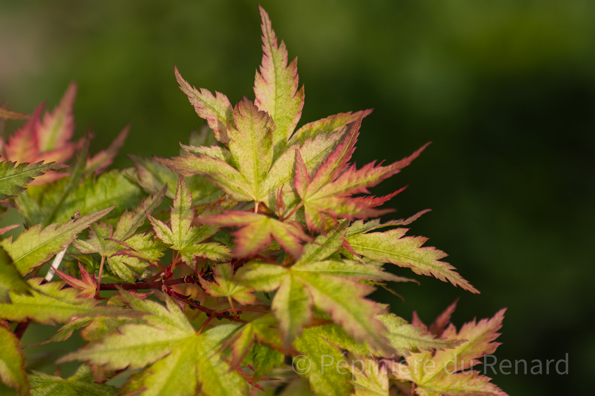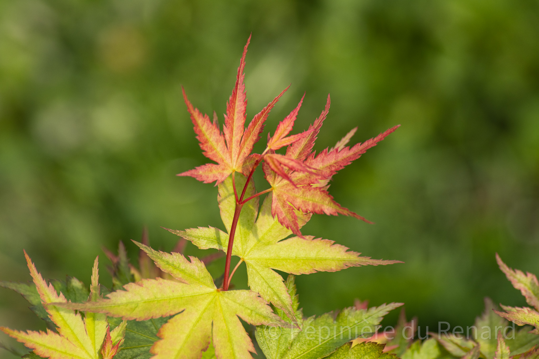 Été : feuillage plus vert, parfois moucheté/nuancé selon conditions ; jeunes pousses possibles à nouveau corail.