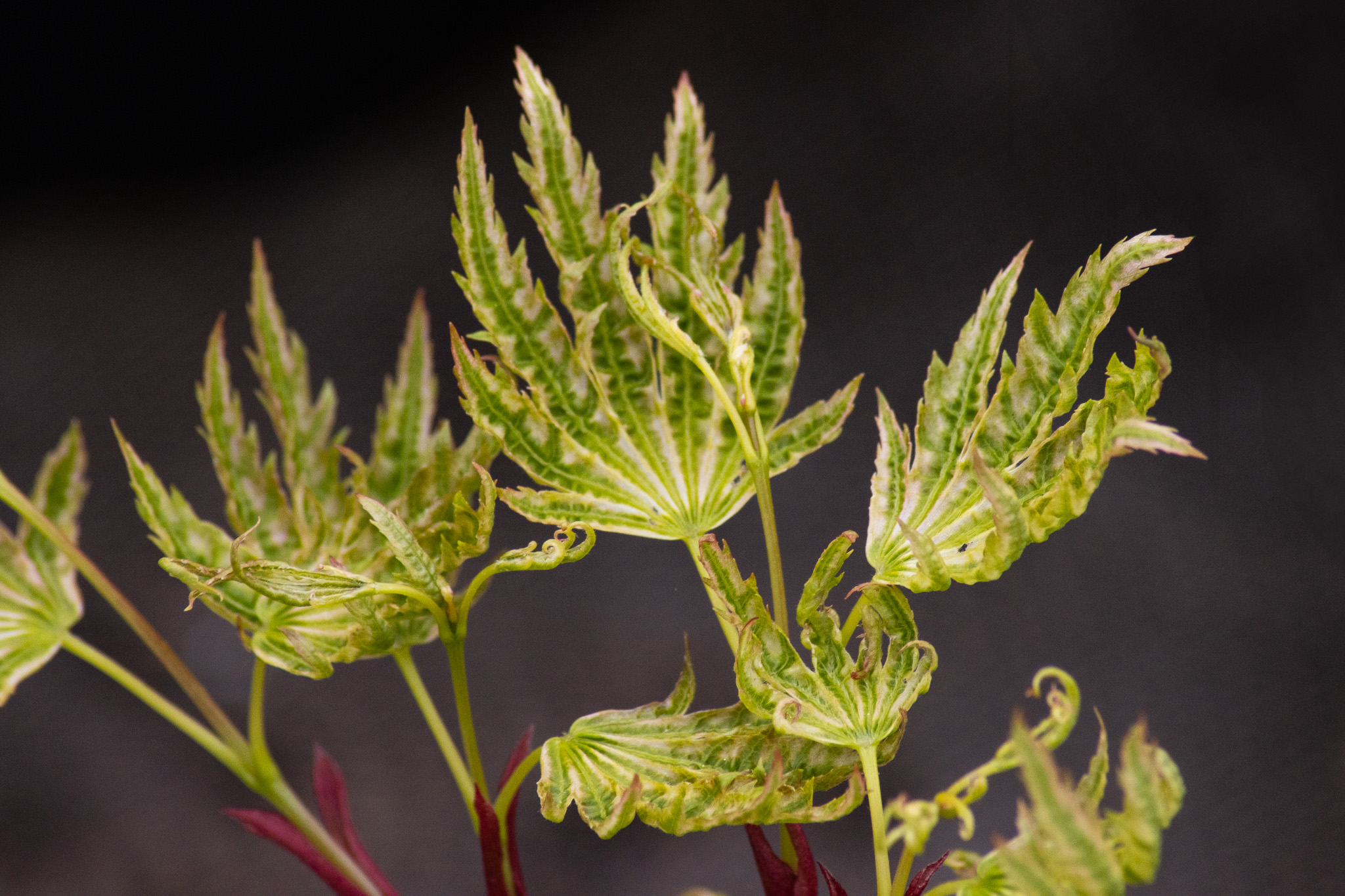 Le débourrement est spectaculaire (feuilles encore enroulées/compactes), puis mise en place d’une panachure crème avec nervures vertes et, selon conditions, un liseré rosé.