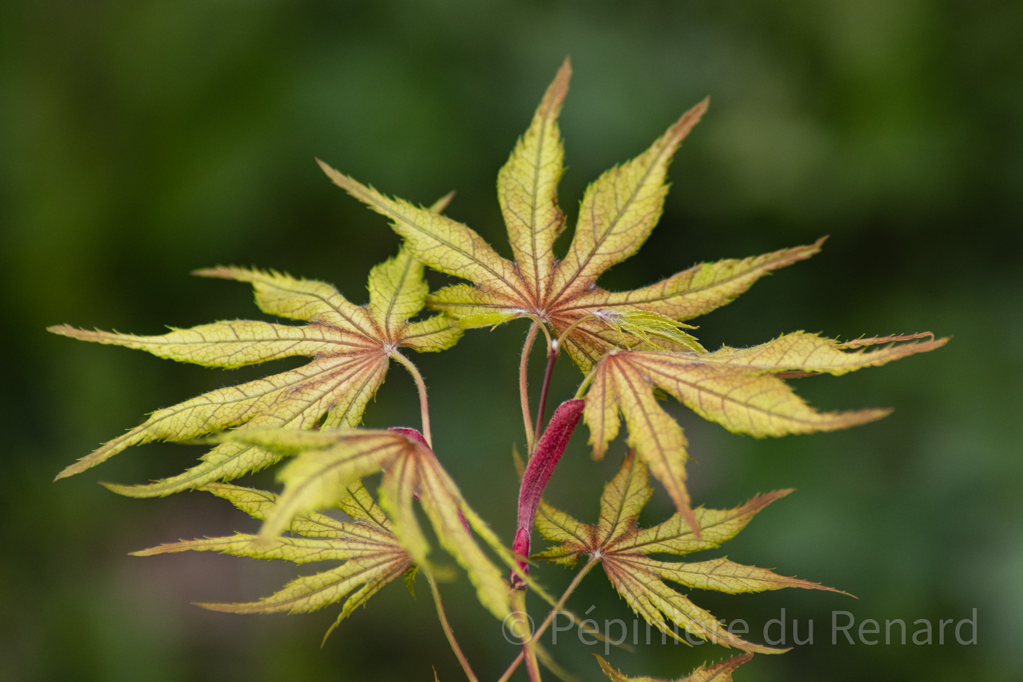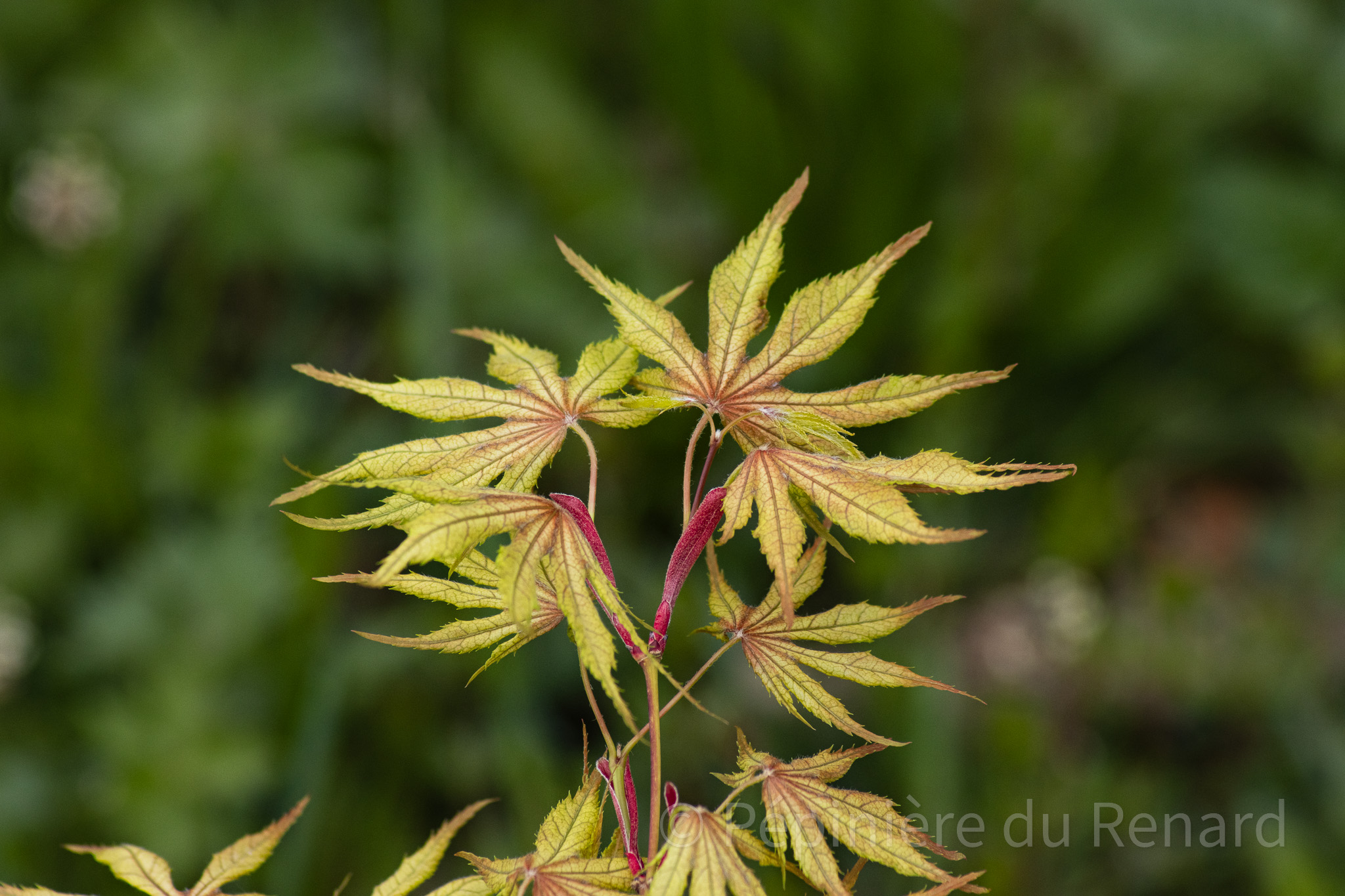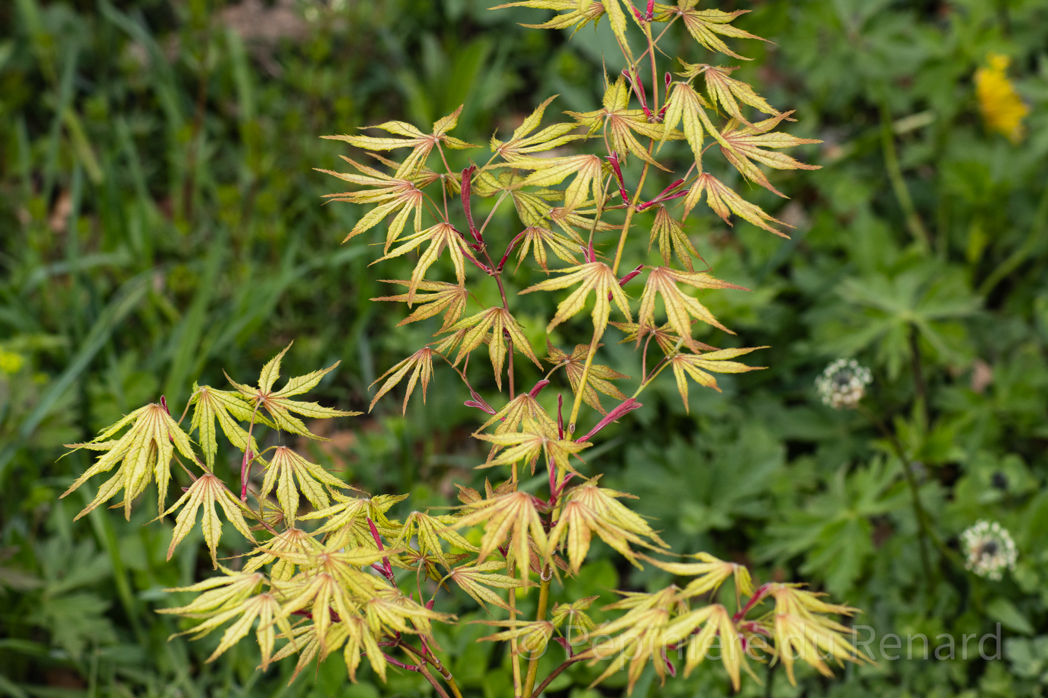 ‘Will’s Devine’ se classe parmi les érables à feuillage réticulé : le contraste nervures/limbe est l’élément clé. L’intérêt est double : un débourrement très lumineux et une nervuration sombre qui reste lisible, donnant un rendu “collection” sans excès. Le feuillage est profondément découpé, ce qui ajoute une texture fine et légère.
