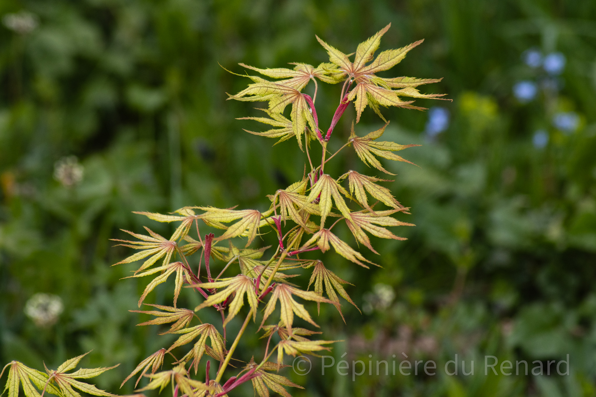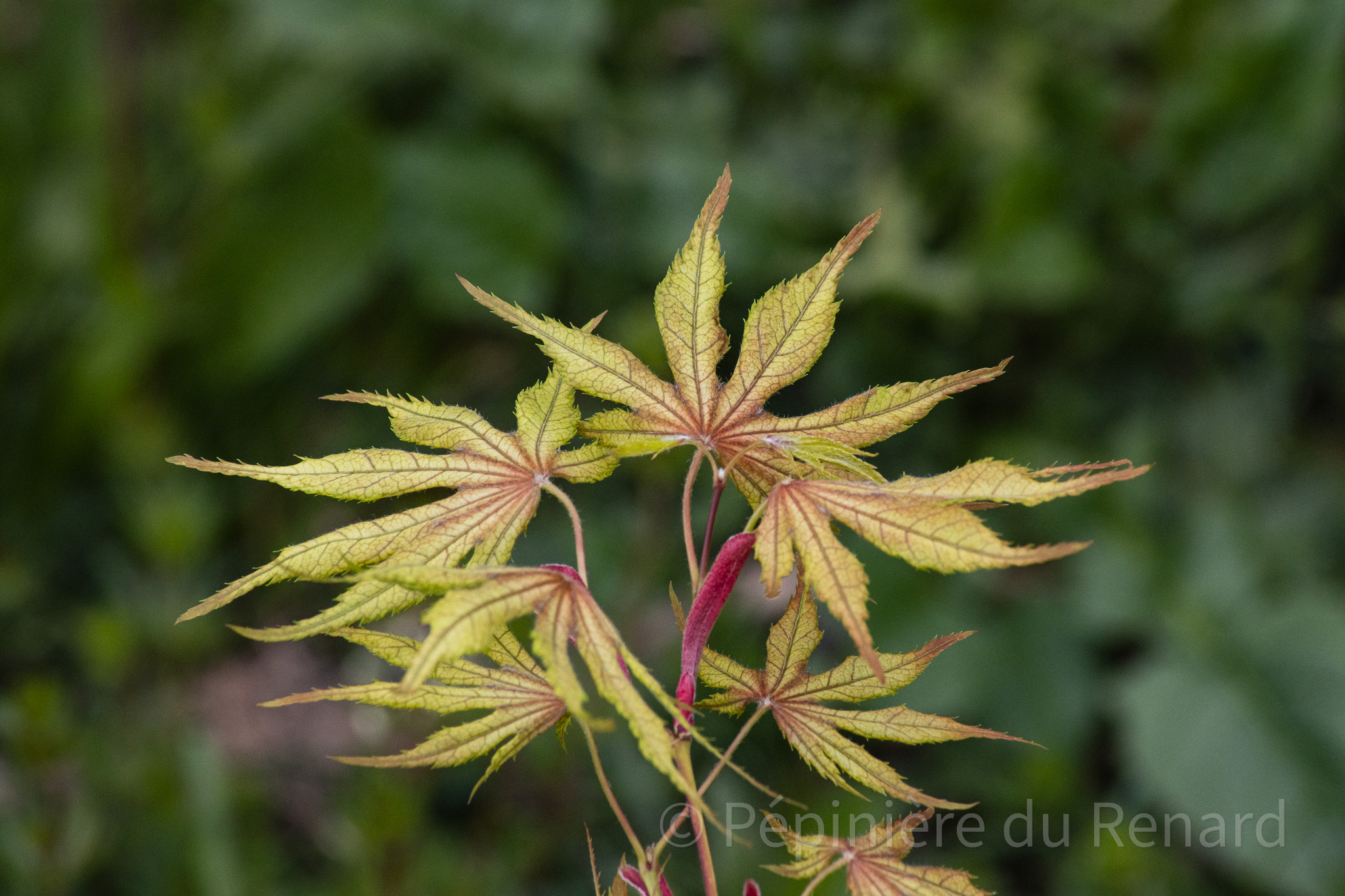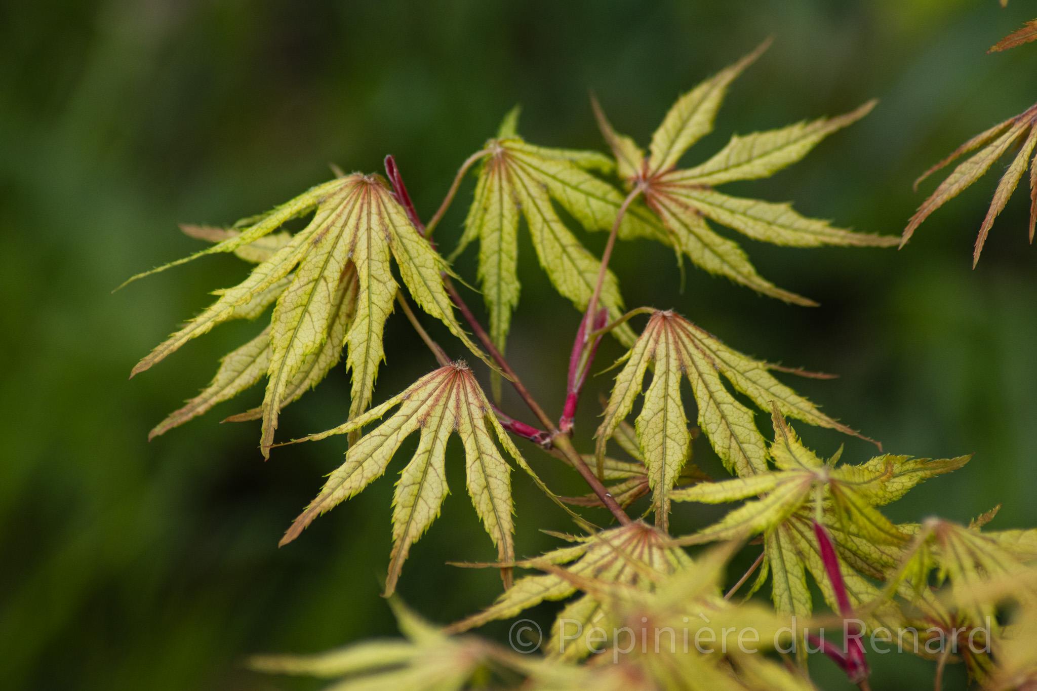 ‘Will’s Devine’ se classe parmi les érables à feuillage réticulé : le contraste nervures/limbe est l’élément clé. L’intérêt est double : un débourrement très lumineux et une nervuration sombre qui reste lisible, donnant un rendu “collection” sans excès. Le feuillage est profondément découpé, ce qui ajoute une texture fine et légère.